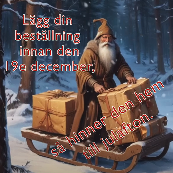 Var ute i god tid. Lägg din beställning innan den 19 december. Så hinner det fram till julafton. Välj DHL, det är vår snabbaste frakt.