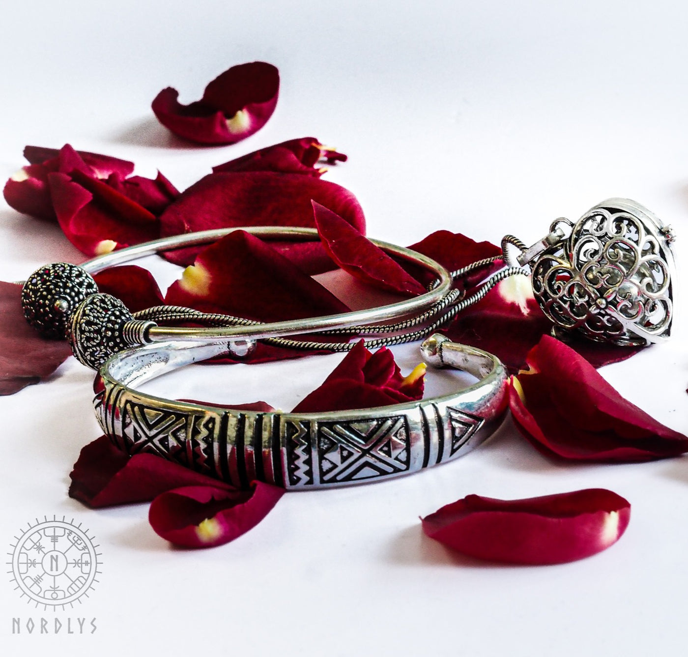 Ett vackert set till din kära med två vikinginspirerade armband och en änglaklocka i form av en hjärtformad berlock med en pingla i. Hänget kommer på en 55 cm lång kedja i stål. Mått och material: Kedja i rostfritt stål 55 cm.Armband och hänge i Silverpläterad mässing.Allt nickelfrittt.
